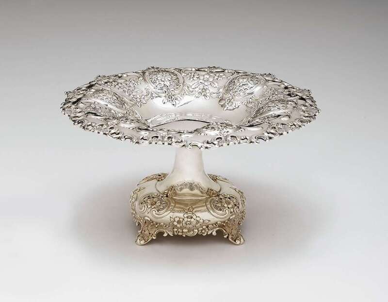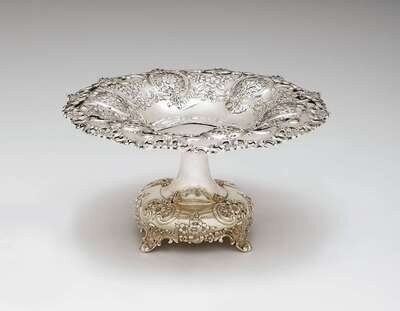 The pierced dish decorated with shells, scrolls, blossoms and flowerheads, raised on a swollen base with similar decoration ending in scrolled toes.
