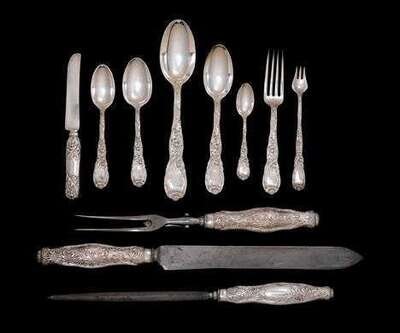 Comprising 16 luncheon forks, 6 dessert knives, 7 soup spoons, 12 teaspoons, 15 demitasse spoons, 3 dessert spoons, 12 serving spoons, 3 piece carving set and 12 oyster forks. (86).
