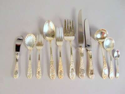 Comprising 12 dinner forks, 12 dinner knives, 12 salad forks, 23 teaspoons, 12 iced tea spoons, 12 demitasse spoons, 9 butter knives, a cold meat fork, a salad serving fork, a gravy ladle, a serving spoon and a jelly spoon. ( 97).