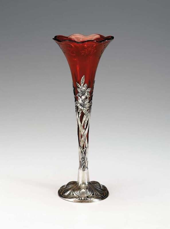 Gorham sterling silver and cranberry cut glass trumpet vase