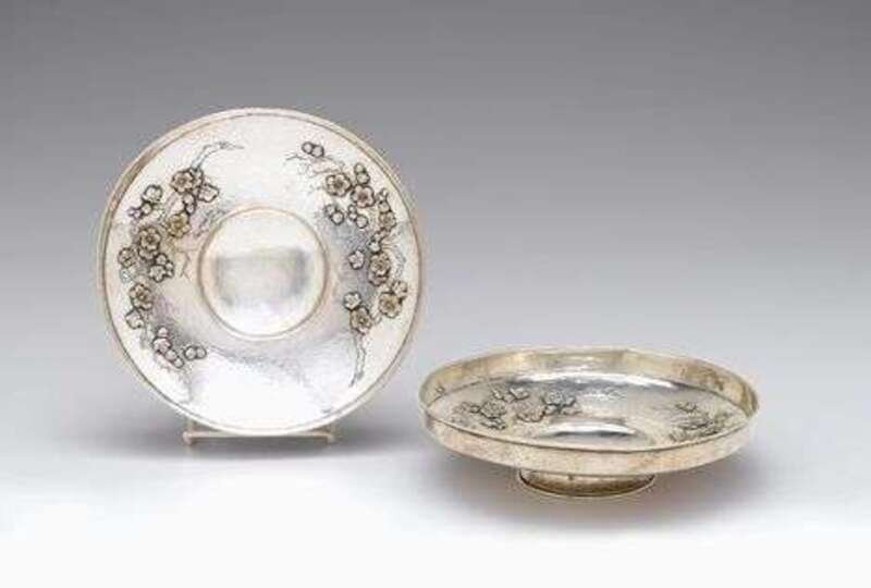 Each with applied cherry blossom branches, raised on a circular foot.