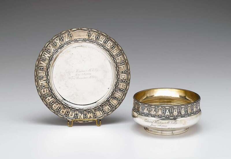 Each decorated with a continuous band of letters of the alphabet and inscribed 'Edward Winton McVitty, June 7th, 1906 From Grandma McVitty'.