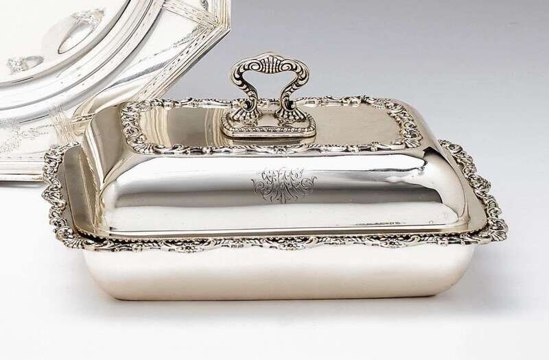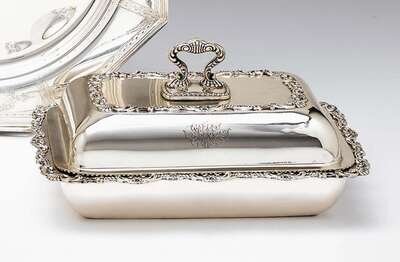 Rectangular with a shell and foliate scroll cast border, the cover with a scroll loop handle and monogram GAC.