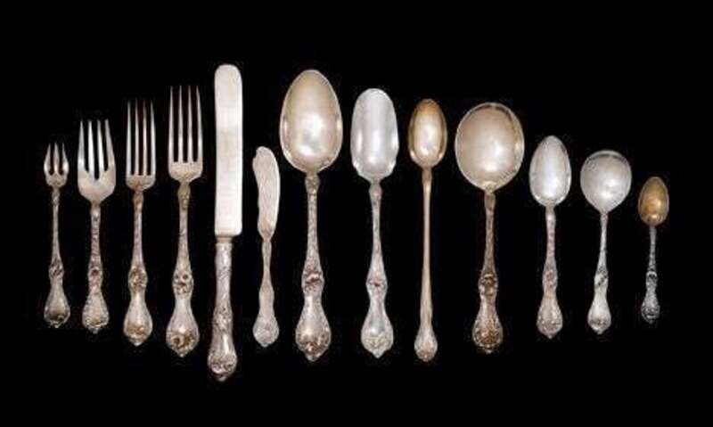Comprising 9 dinner forks, 11 dinner knives, 9 luncheon forks, 15 dessert forks, 16 butter spreaders, 48 teaspoons, 11 oyster forks, 11 bouillon spoons, 12 soup spoons, 11 demitasse spoons, 9 iced tea spoons, 13 grapefruit spoons, 6 tablespoons, a cheese scoop and 2 cake slices. (184).