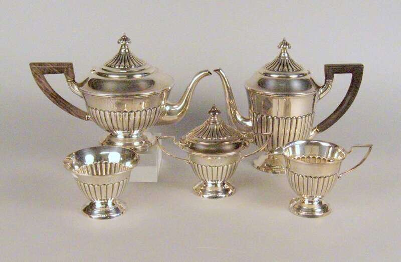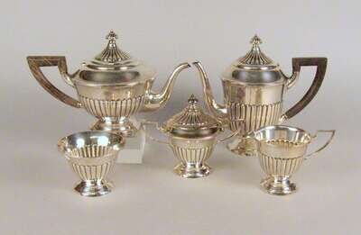 Comprising a teapot, coffeepot, cream jug, sugar bowl and waste bowl, each with a lobed design and monogrammed DKH, the pots with treen handles and curved spouts. (5).