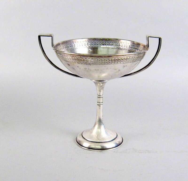 With two handles and pierced rim, raised on a spreading standard and circular foot.