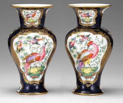 In the Worcester style, the reserves decorated with exotic birds against a blue scale ground, with gilt highlights, spurious underglaze blue box mark. (2).