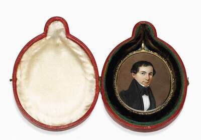 Watercolor on ivory, depicting a young man with dark hair and wearing a black coat and tie, inscribed 'Clark' and 'My Brother'; in a leaf molded gilt metal case with glazed oval panel to reverse, in a fitted red leather case.