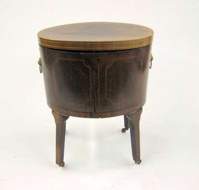The oval hinged top opening to a plain interior with lion mask handles to the sides and satinwood banding, raised on square legs, ending in casters.