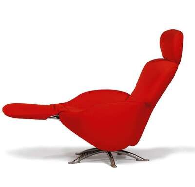 Designed in 2000 for Cassina. Nickel-plated steel frame construction, upholstered in red fabric. Swivel base, fully reclining with adjustable headrest and footrest.