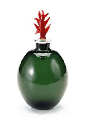 Emerald green glass, of ovoid form with red organic form stopper. Signed 'Venini '96'.