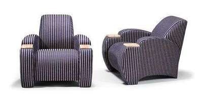 Pair of 'New York, NY' Art-Deco style club chairs. With striped upholstery and marble-finished armrests. .
