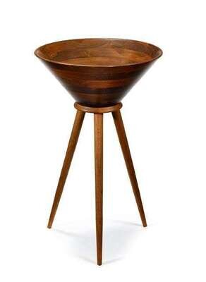Large, round angular bowl in layered walnut fixed atop a three-legged teak base.