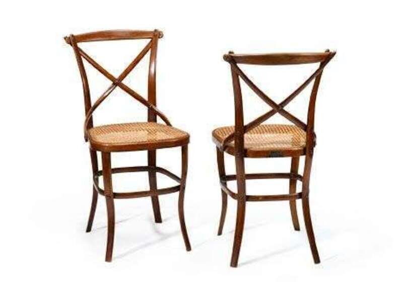 Model no. 91. Each with an x-shaped backrest and caned seat, with a branded mark and a retailer's plaque inscribed 'Thonet Hermanos, Barcelona, 40 Pelayo 40'. (2).