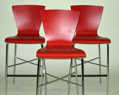 Each with a bent plywood seat with flared back rest, narrow waist and smooth rounded seat. Stained red with chrome legs and cross-beam supports, rubber coated foot rest.