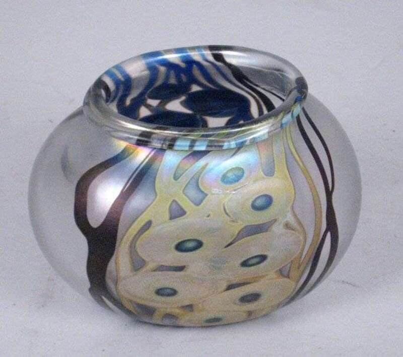 Studio glass with ovoid shape with organic, free form designs with applied iridescent glaze.