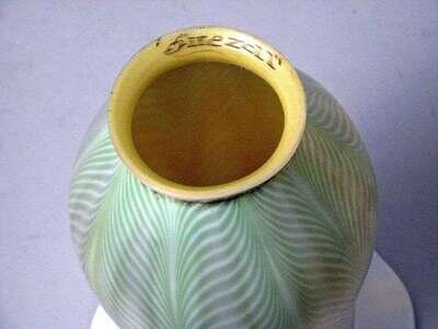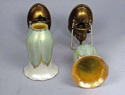Flared Quezal glass shades in the Aurene style in opalescent white with green and gold pulled feather decoration. Brass wall mounts with oval wall plate and fluted sockets.