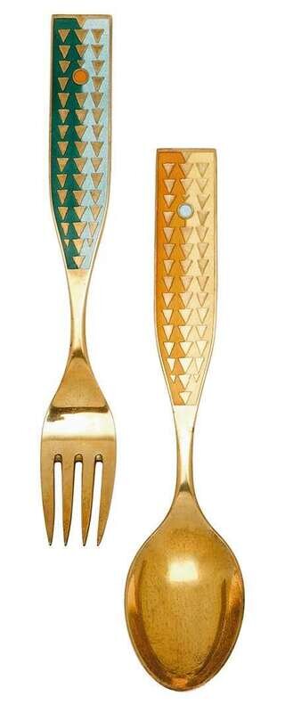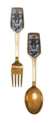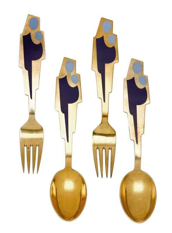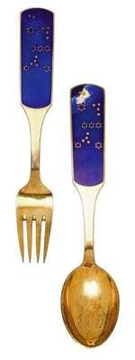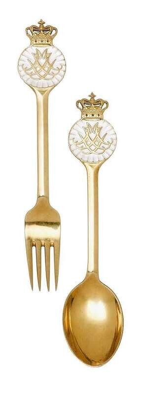 Group of five annual Christmas silver gilt and enameled spoons and forks anton michelsen, danish