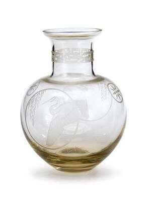 Of baluster form with wide neck and flared mouth, decorated with etched crane in circular medallion and geometric designs, signed "Perry Coyle".