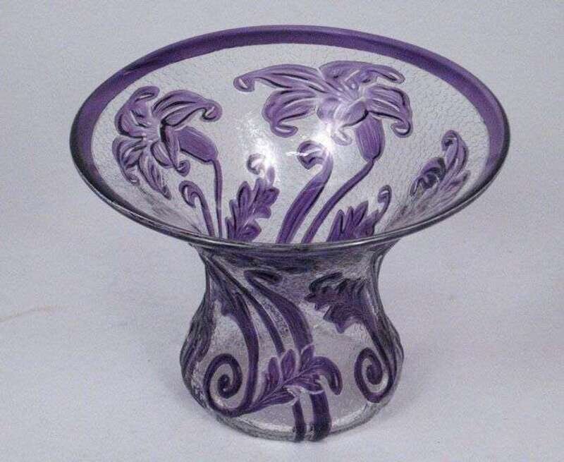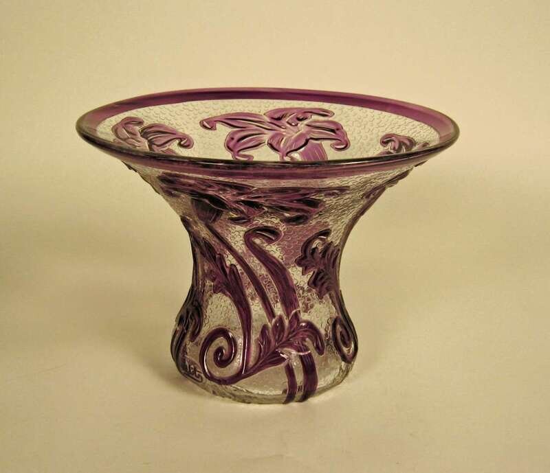 Amethyst glass cut to clear to show stylized floral decoration. Signed "Webb".