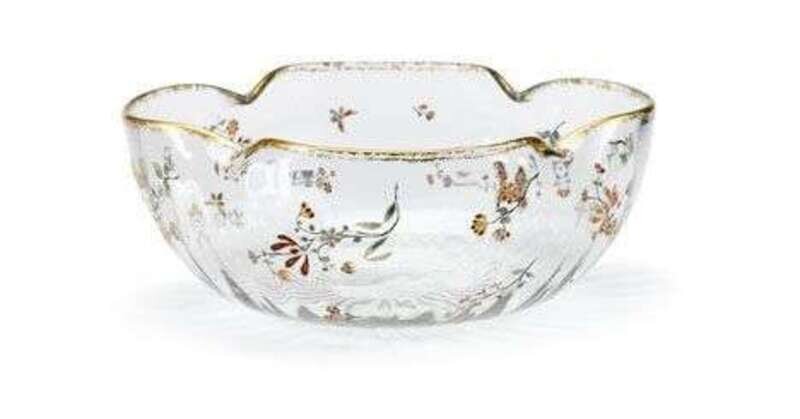 Gilt rim with quatrefoil shape. Applied floral motifs arranged randomly throughout bowl.