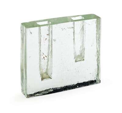 Of squared form in clear glass with two recesses for holding flowers.