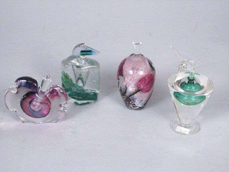 Pink ovoid form with encased flowers, green inverted triangle with hummingbird stopper, free form with fish stopper, and pink flower form.