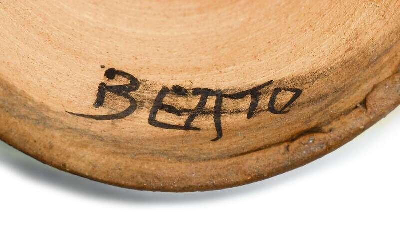 Rounded bowl form raised on a cylindrical stand, with metallic teal glaze. Signed 'BEATO.'