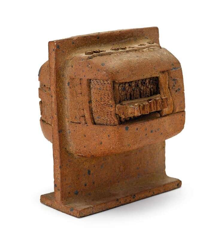 Abstract form, resembling television and radio,modeled in brown clay.