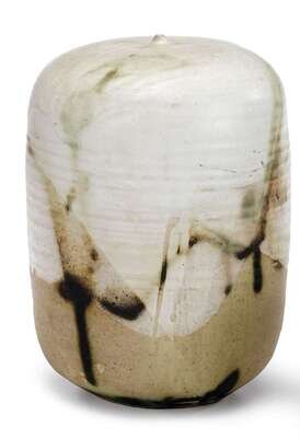 Of cylindrical form with flat base, with narrow, nearly closed mouth. Glazed in shades of white, brown and green. Signed on the bottom with the artist's opposed T's.
