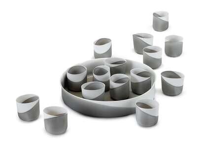 Large translucent porcelain dish with fifteen matched cups, each signed 'PS 2001.'
