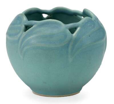 Small pot of shouldered ovoid form and band of reticulated leaves around rim. Blue-green crackle glaze, signed 'Van Briggle / Colo. Spgs.' with trademark conjoined 'A's.'