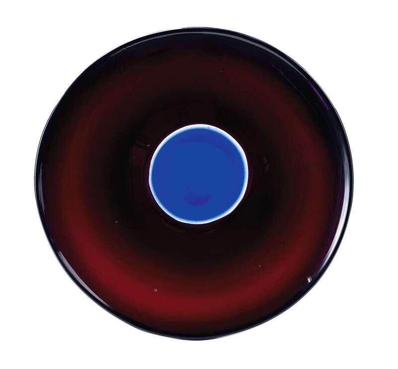 Blue glass center surrounded by a wide rim of amethyst colored glass.