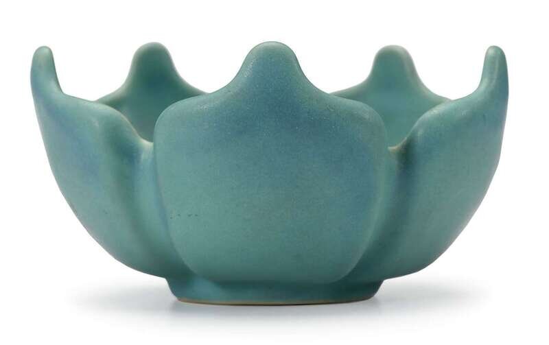 Floral form bowl with five foliate petals radiating from he circular base. Blue-green crackle glaze, signed 'Van Briggle / Colo. Spgs. Colo.' with trademark conjoined 'A's.'