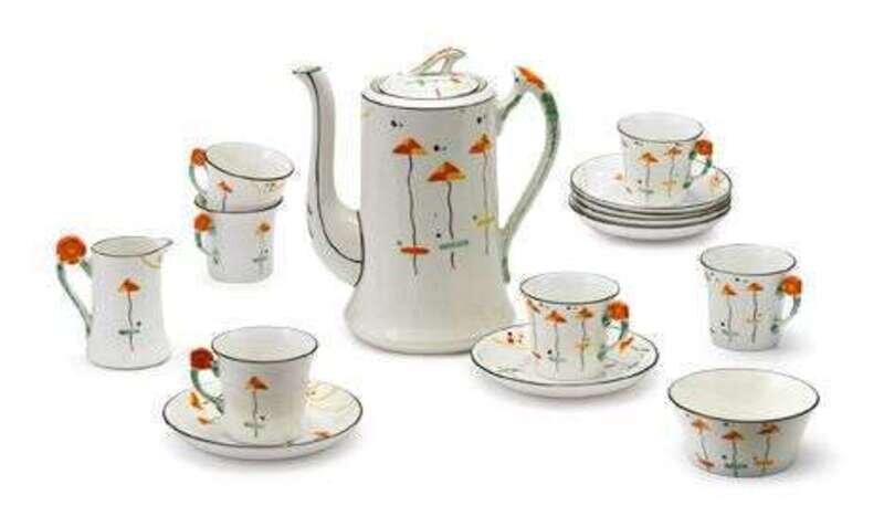 1950s. With stylized orange, yellow and green decoration, comprising a coffeepot, creamer, sugar and six cups and saucers, printed marks.