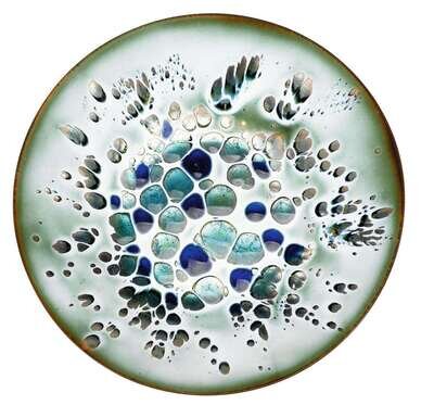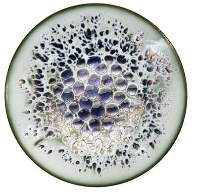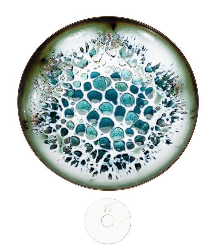 Each copper plate enameled with bright colored splashes to the center. Three small plates enameled in tones of orange, teal and blue. Two medium plates enameled in tones of teal and blue. Three large plates enameled in tones of lavender and teal. Stamped "Hansen."