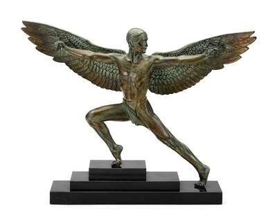 ART DECO BRONZED METAL WINGED MALE FIGURE early 20th century Shown standing, ascending stairs with arms and wings outstretched, on black plinth base.