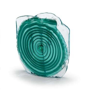 Free form shape with central spiral design using both green and white glass. Three recesses located in the center of the vase used to place flowers. Signed 'Fulvio Bianconi' on base.