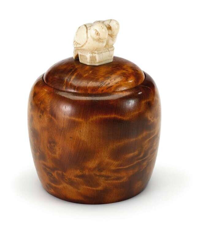 Carved in a rounded cylindrical form with bone finial carved to show a pair of perched lovebirds atop a turned, snug-fitting lid. Bottom is stamped 'Made in France,' and carved 'Hufa wood FWTie'.