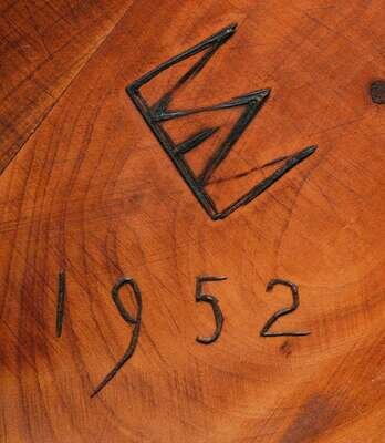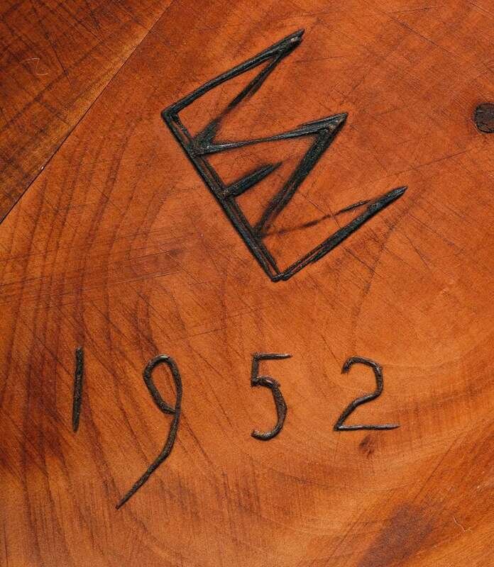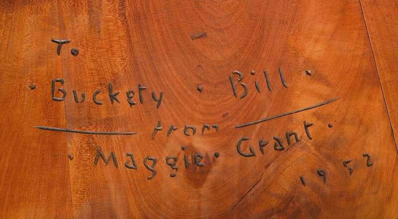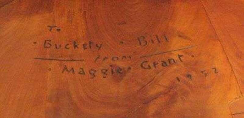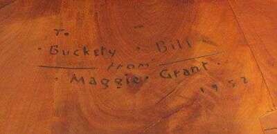 Organic form top with splayed legs, signed and dated 1952 on the underside. Inscribed "To Buckety Bill from Maggie Grant, 1952."