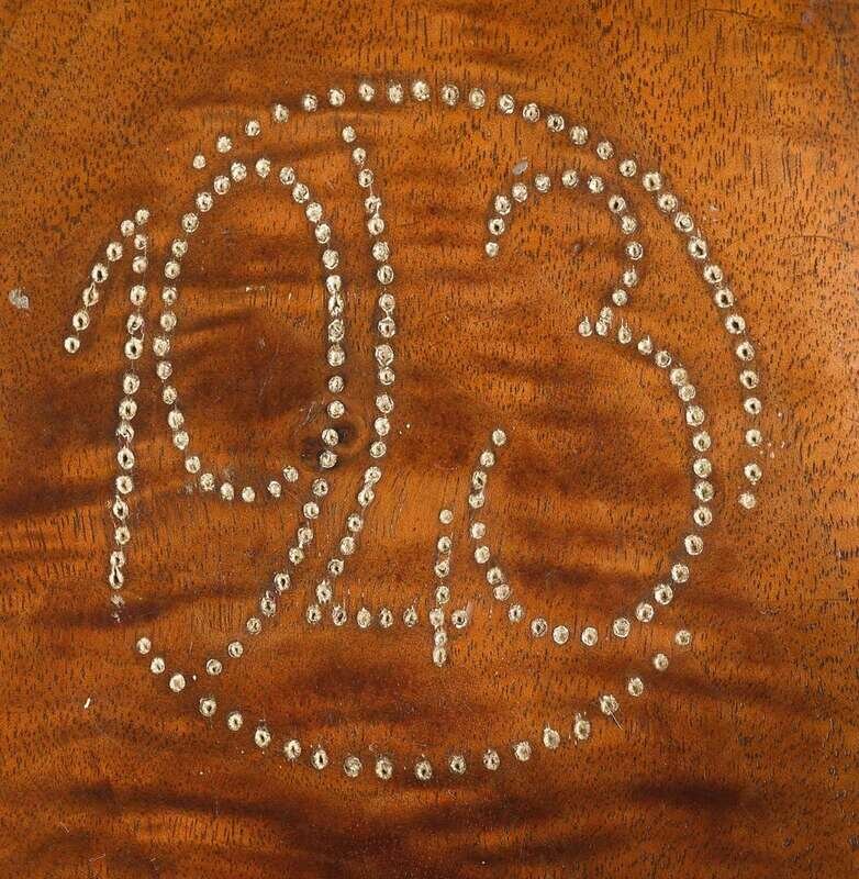 Free-form triangular top with smooth, rounded edges above three splayed flaring legs. Stamped '1943' to underside.