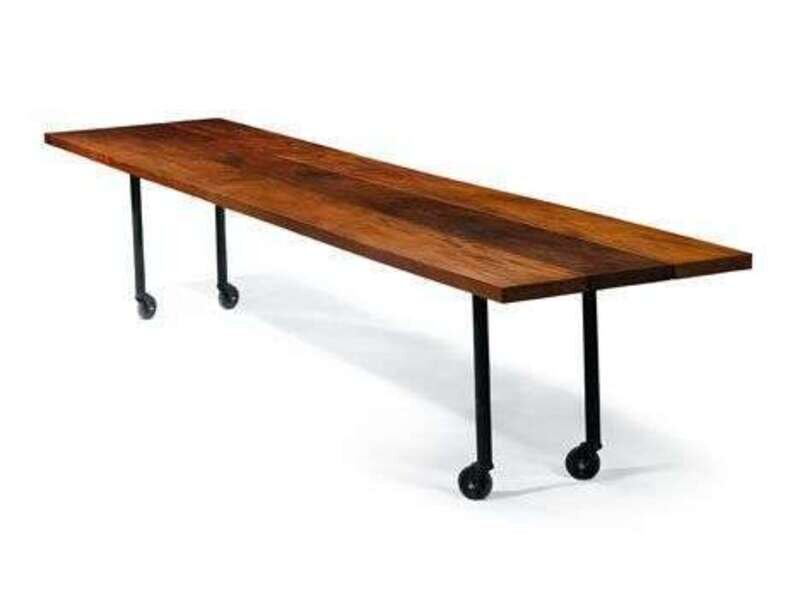 Designed and manufactured in mid 1960s, mahogany planks atop a black brushed steel base with casters.