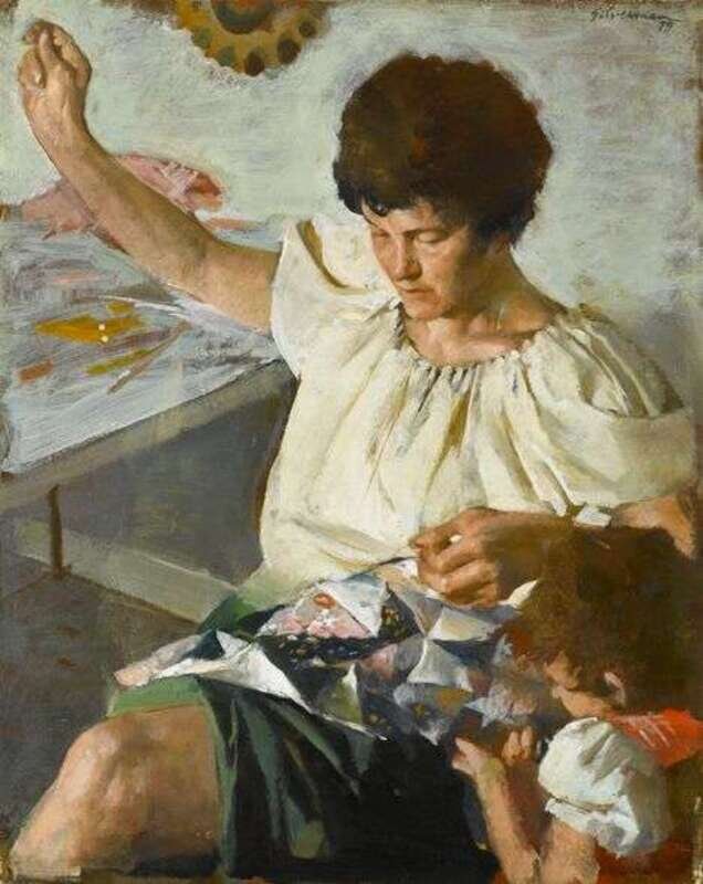 BURTON SILVERMAN (AMERICAN B. 1928) SEWING A PATCHWORK QUILT