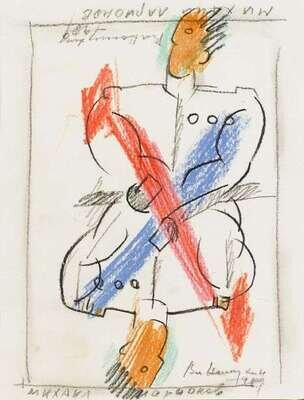 Signed and dated '1989' upper left and lower right and inscribed in Russian at top and bottom, crayon on paper