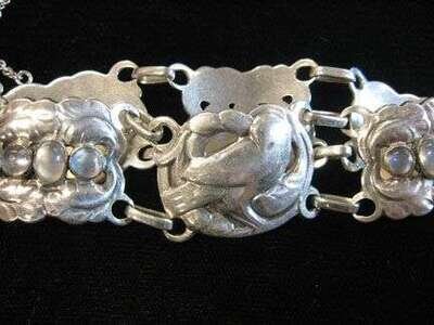 Six love bird and moonstone panels terminating in slide clasp with safety chain.