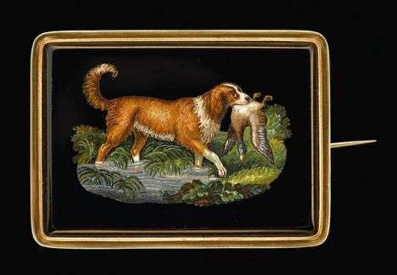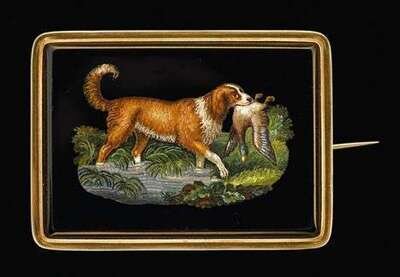 14 karat yellow gold and micro mosiac "spaniel" brooch