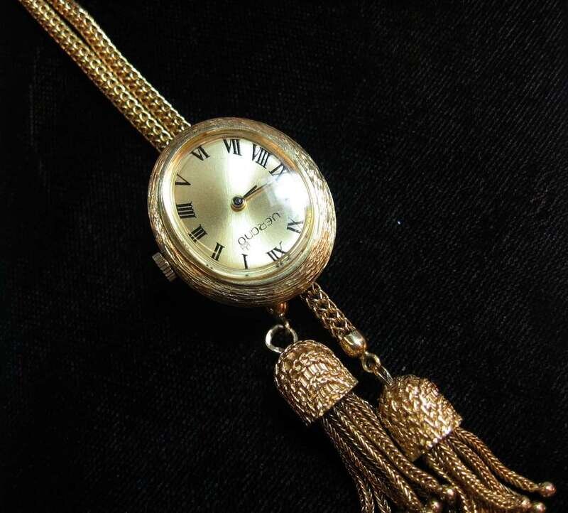 Hollow woven necklace with a smaller tassel attached at the end, suspended with an oval pendant watch with Roman numeral design dial on yellow gold face.