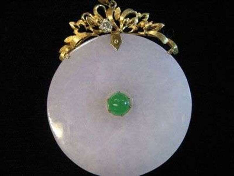 Disk of polished lavender jade set with a petite orb of apple green jade and accented by a yellow gold setting and a .25 carat Old European cut diamond.