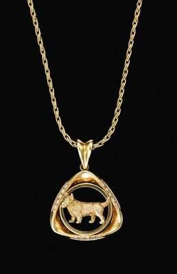 The pendant on elongated neckchain features a Terrier within a diamond set into a triangle.