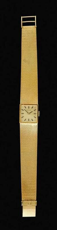 Brushed square faced wristwatch, with dash dial, face marked Tissot "Swiss Made", woven 18 karat yellow gold bracelet. Clasp marked "750".